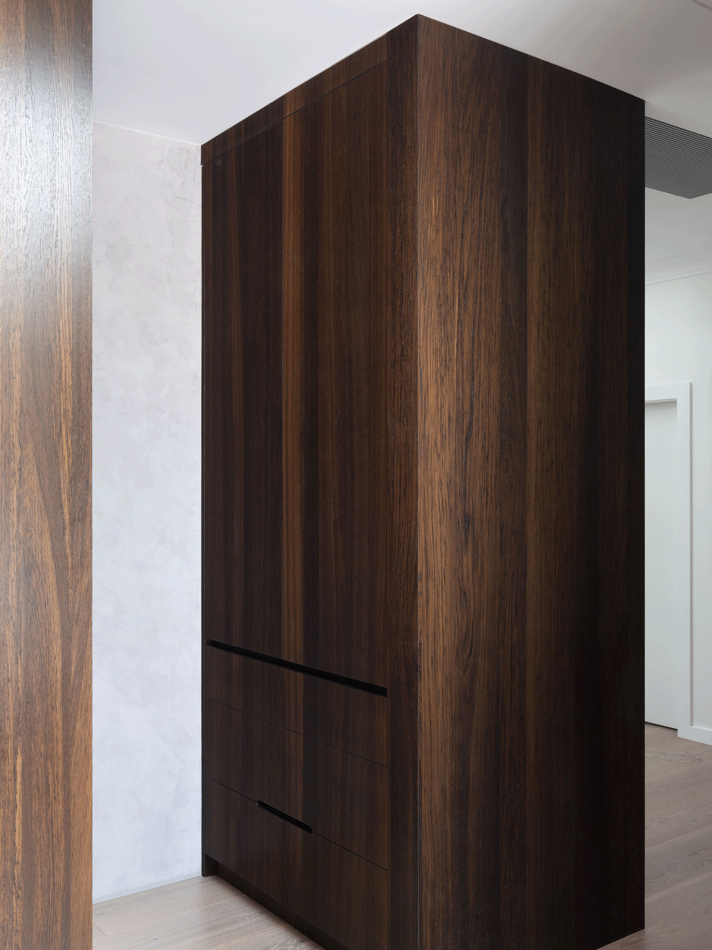Meticulous detailing enhances the sense of refinement: recessed lighting, concealed handles, and slide-away doors that reveal a pantry designed as an unobtrusive extension of the joinery, enhancing spatial clarity and functionality.