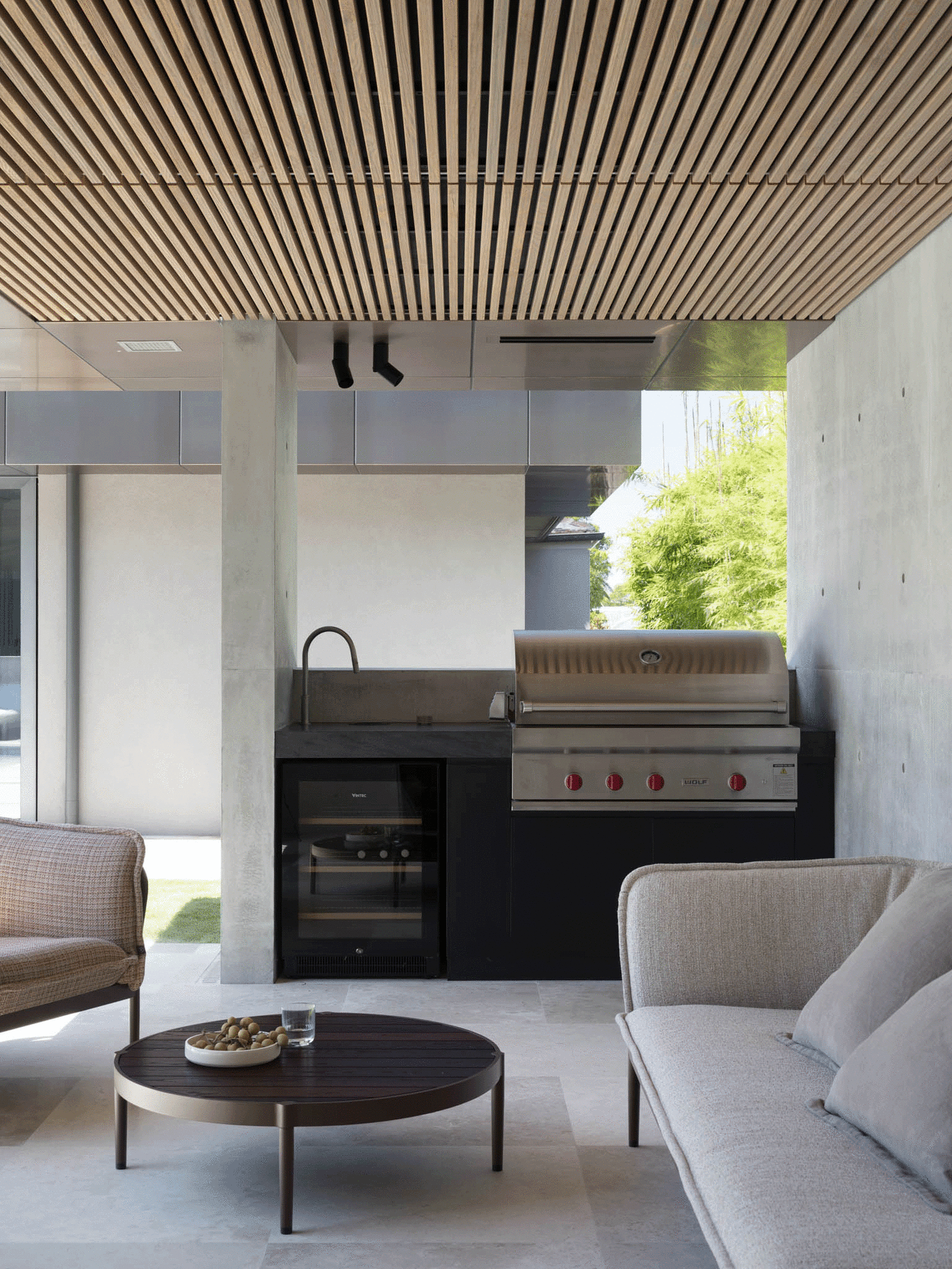 Adjacent, a pool pavilion incorporates a ceiling outdoor shower and an undercover entertaining zone with a barbecue and bar fridge. A powder room, change room, and shower—each illuminated by skylights—complete this dedicated leisure wing. Off-form concrete walls, recessed lighting, and timber batten ceilings reinforce a sense of crafted permanence balanced by warmth.